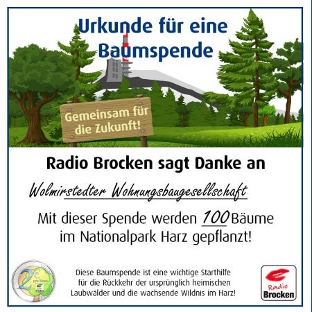 Rückwirkend ab dem 01.01.2021 spenden wir für jeden Mietvertragsabschluss einen Baum und unterstützen damit die aktuelle Radio-Brocken-Aktion. Eine Spende für 100 Bäume haben wir bereits getätigt.