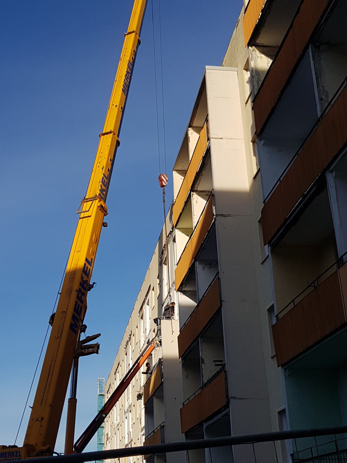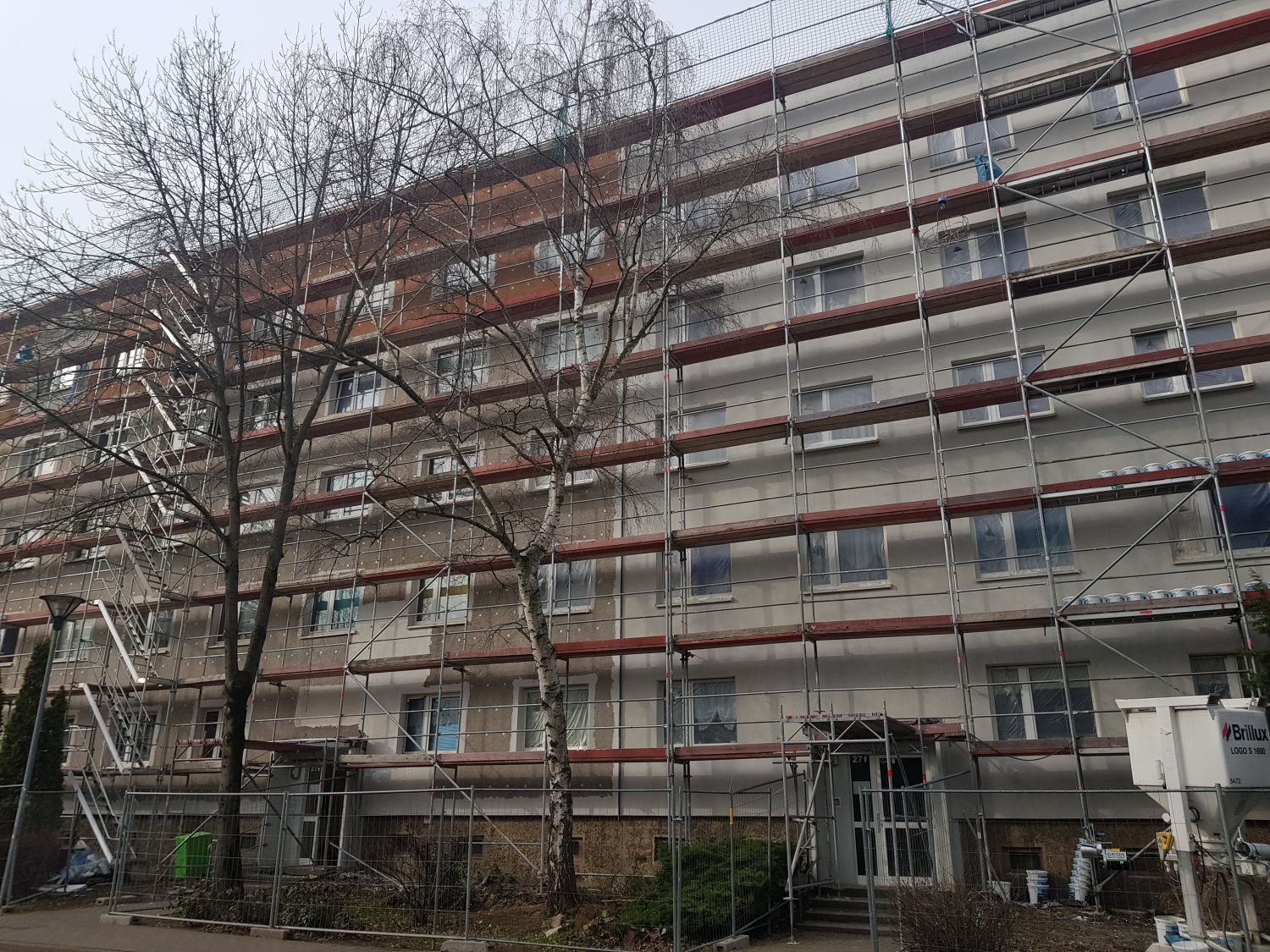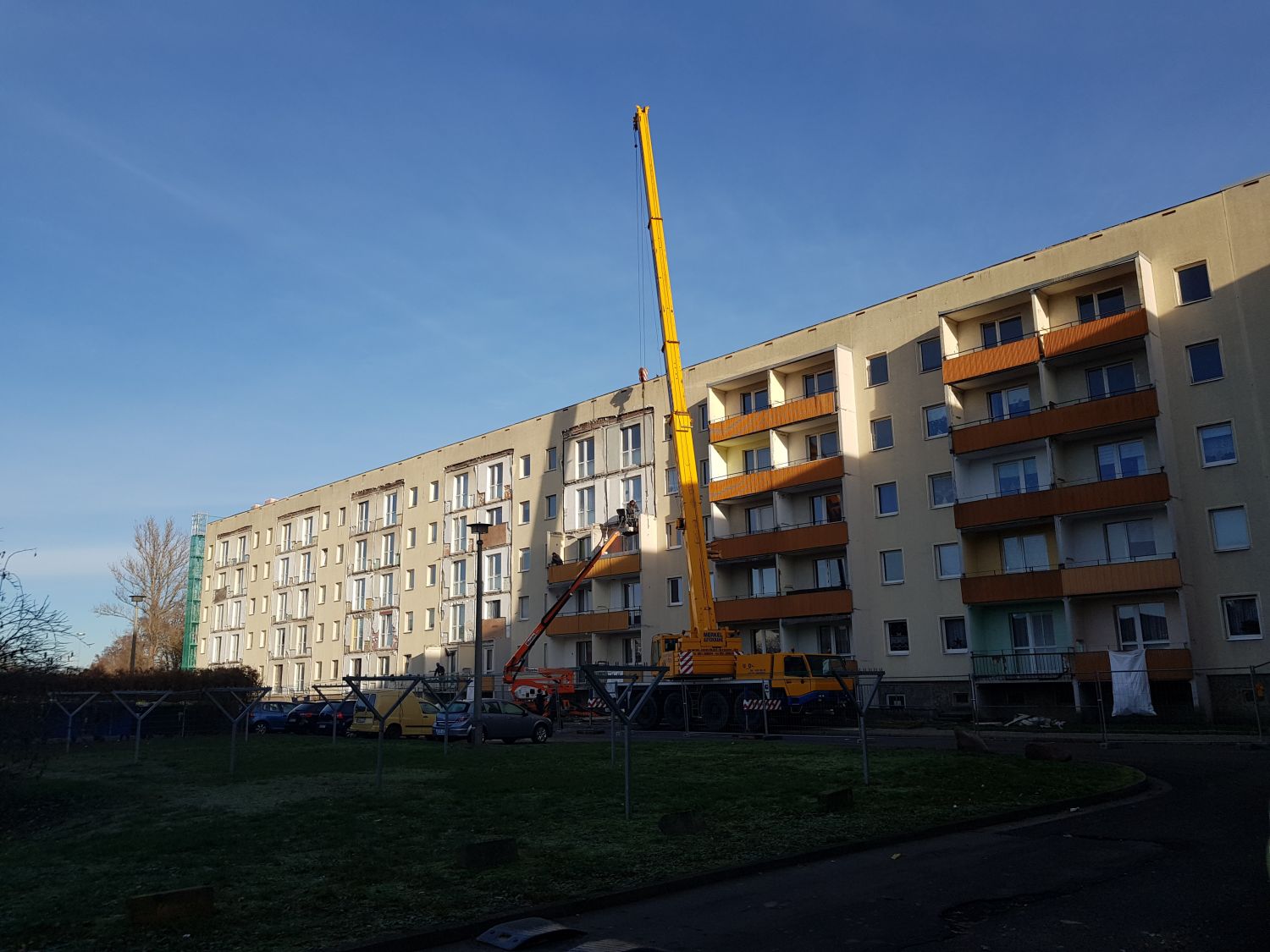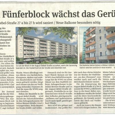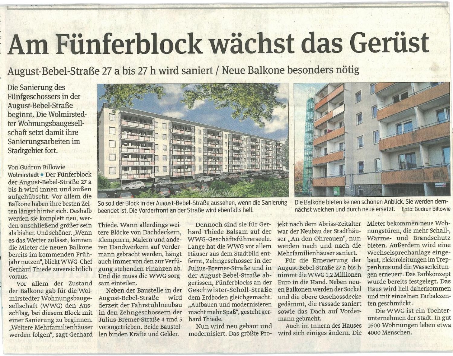 Das Wohnhaus in der Augsut- Bebel- Straße wird von der WWG saniert. Die alten Balkone werden entfernt und durch größere Balkone ersetzt, die Wohnungen erhalten Brandschutztüren, es werden Gegensprechanlagen nachgerüstet, das Dach wird erneuert und die Fassade bekommt einen neuen Glanz. Hier einige Bilder zum Baufortschritt: