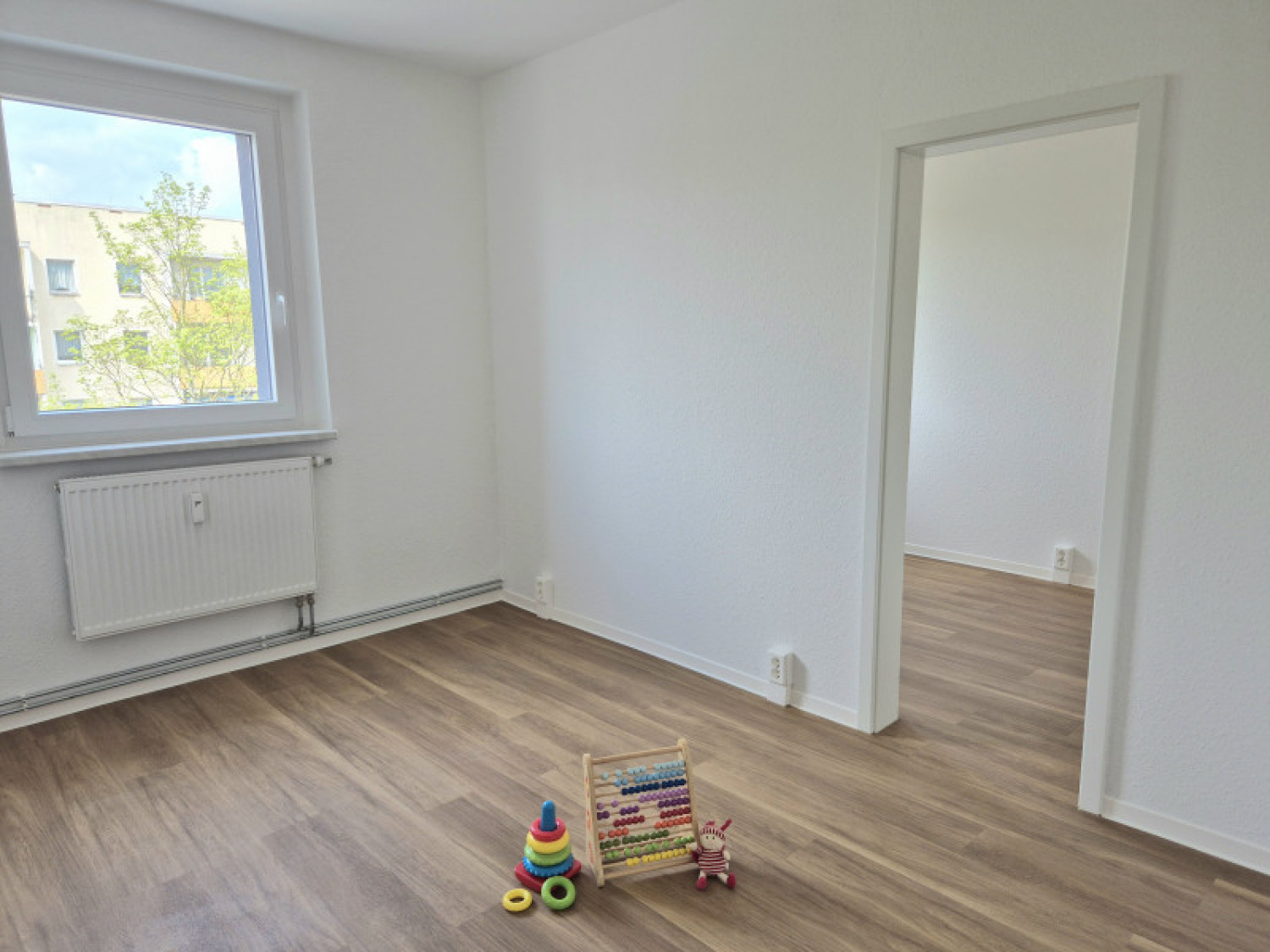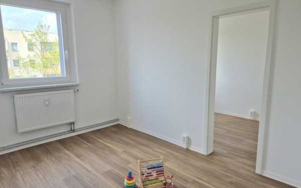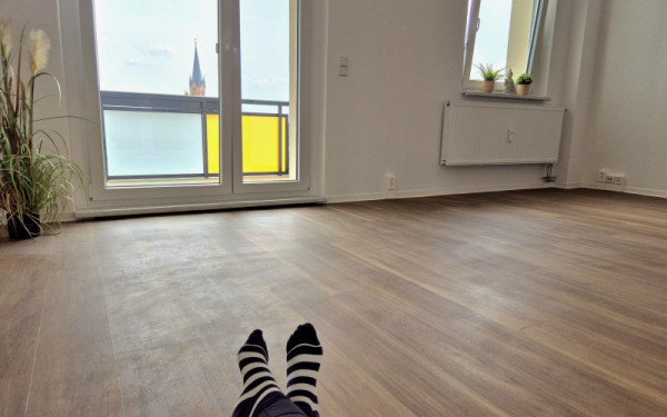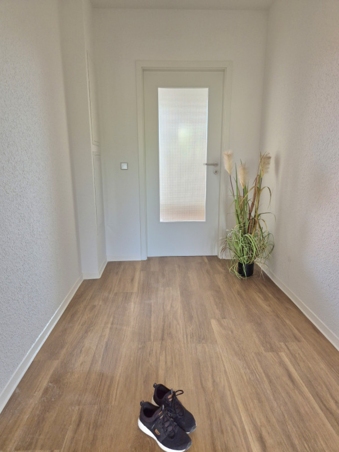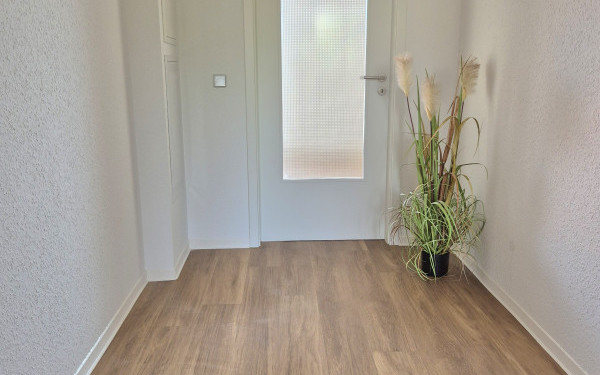 Die Wohnung wurde kürzlich komplett renoviert, d.h. die Elektrik, die Bodenbeläge, die Zimmertüren, die Tapeten wurden erneuert. Auf den Fußböden wurde ein Designbelag (PVC-Planke) in Holzoptik verlegt. Das Bad ist mit einer Dusche ausgestattet und im modernen Design gefliest.