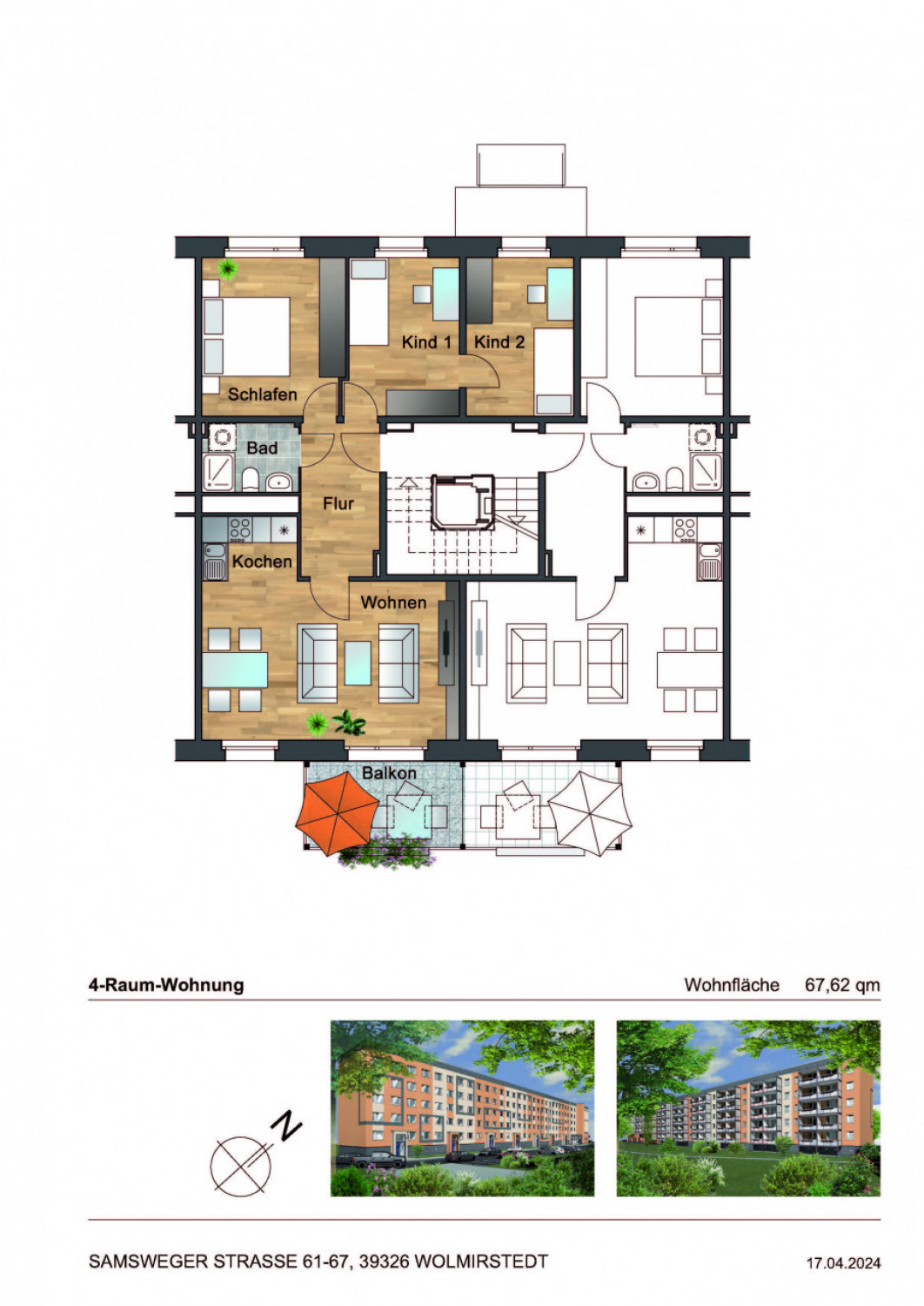 Das sich über mehrere Hauseingänge erstreckende Gebäude ist trotz zentrumsnaher Lage ruhig gelegen. Es gehört zum Rathausquartier. Ein Hauseingang umfasst insgesamt 10 Wohnungen, die sich auf 5 Etagen verteilen. Jede Wohnung verfügt über einen Balkon, von welchem man einen Ausblick in die gepflegte Grünanlage und auf das Wolmirstedter Rathaus hat.