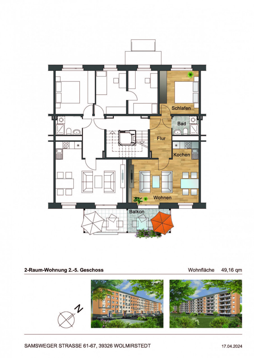 Das sich über mehrere Hauseingänge erstreckende Gebäude ist trotz zentrumsnaher Lage ruhig gelegen. Es gehört zum Rathausquartier. Ein Hauseingang umfasst insgesamt 10 Wohnungen, die sich auf 5 Etagen verteilen. Jede Wohnung verfügt über einen Balkon, von welchem man einen Ausblick in die gepflegte Grünanlage und auf das Wolmirstedter Rathaus hat. Parkplätze finden Sie im öffentlichen Bereich. Das Gebäude wurde in diesem Jahr umfangreich saniert. Die Baumaßnahmen umfassten die Erneuerung der Heizanlage, den Einbau von Aufzügen, die Erneuerung/Vergrößerung der Balkone, die Treppenhaussanierung und die Neugestaltung der Außenanlagen.
